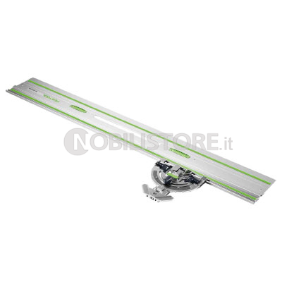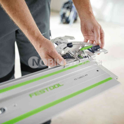 Grazie al sistema di fissaggio rapido, la battuta angolare viene fissata in modo rapido e intuitivo ai binari di guida e, in combinazione con una sega circolare e un piano da taglio e da lavoro, diventa una sega per laminati mobile.
