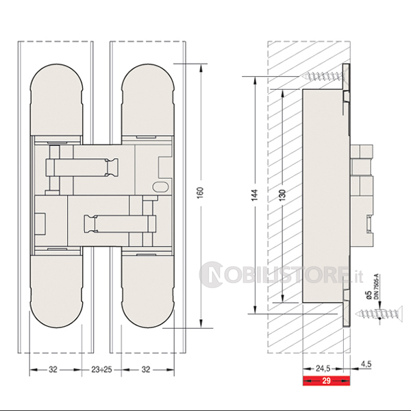 Portata: 80 kg (peso max porta con l'impiego di 2 cerniere, dimensione porta L 850 mm H 2100 mm spessore 40 mm)