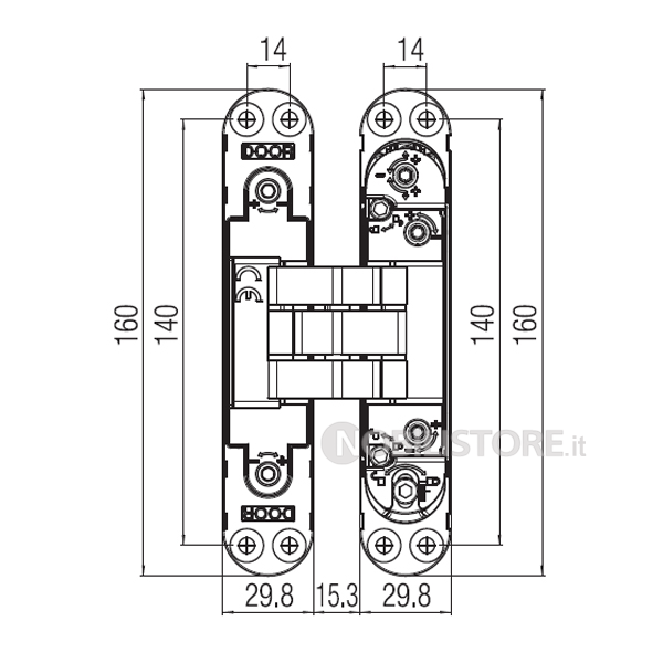 Portata: 80 kg (peso max porta con l'impiego di 2 cerniere, dimensione porta L 900 mm H 2100 mm spessore 40 mm)