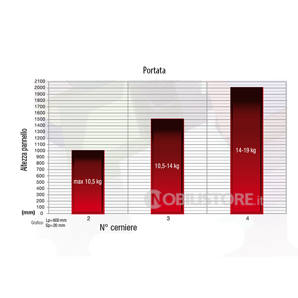 19.0 kg (peso max anta con l'impiego di 4 cerniere, dimensione anta L 600 mm H 2000 mm)