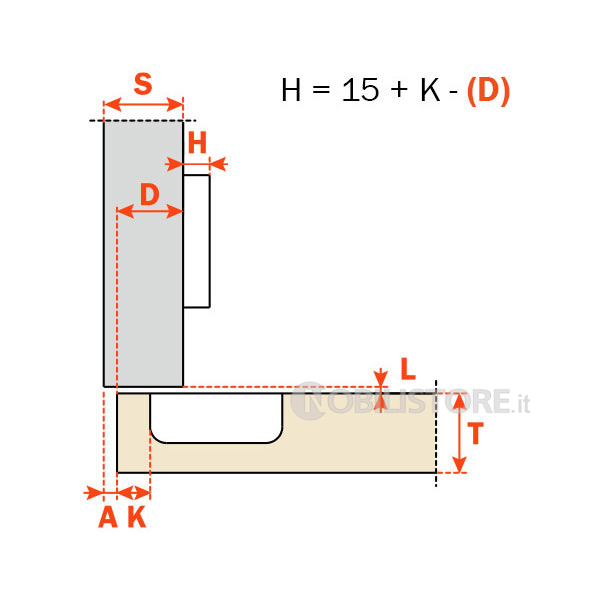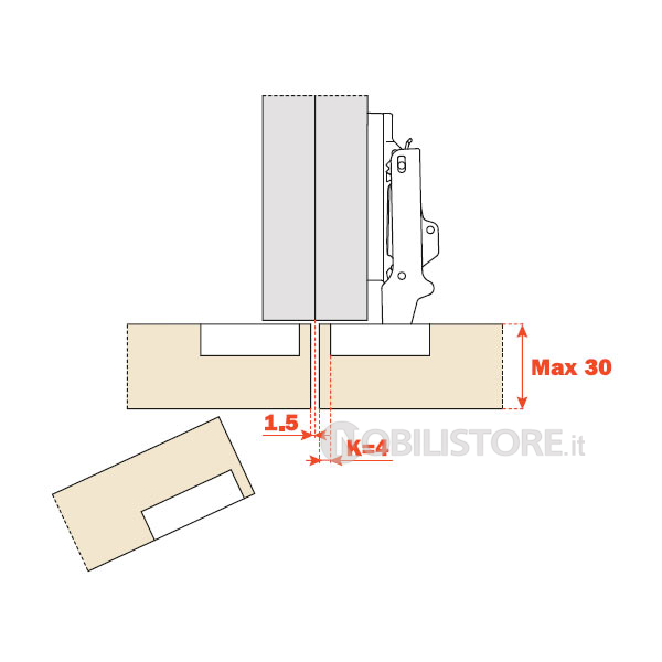 Per vani con elementi estraibili. Allontanamento dell’anta già a 90° di apertura pari a 2 mm con base H=0 e cerniera ala diritta (collo 0).