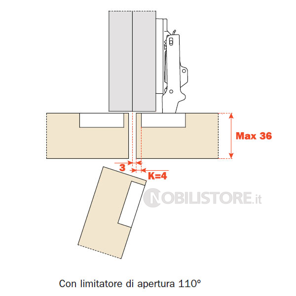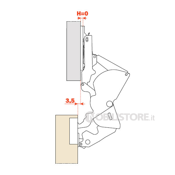 Per vani con elementi estraibili. Allontanamento dell’anta già a 90° di apertura pari a 3,5 mm con base H=0 e cerniera ala diritta (collo 0).