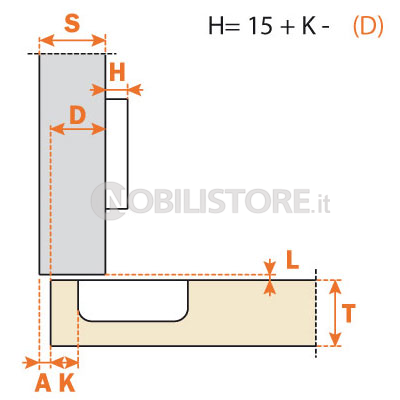 Per vani con elementi estraibili. Allontanamento dell’anta già a 90° di apertura pari a 2 mm con base H=0 e cerniera ala diritta (collo 0).