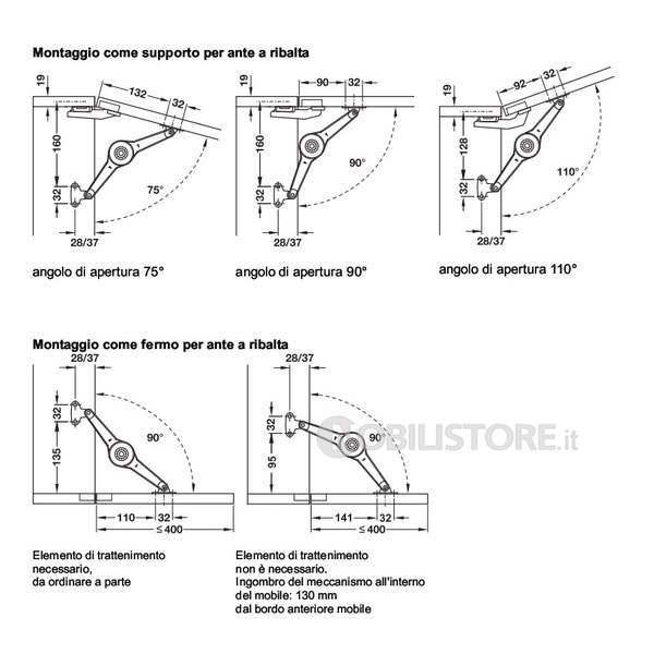 Utilizzabile come supporto per anta a ribalta verso l'alto e come fermo per anta a ribalta verso il basso. Passaggio dalla funzione di supporto alla funzione di fermo invertendo la posizione della leva.