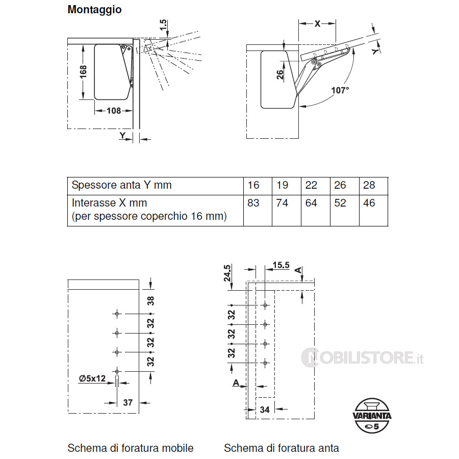 Angolo di apertura 107° (regolabile a 90° con l'utilizzo del limitatore di apertura, da ordinare separatamente)