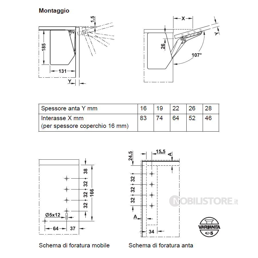 Angolo di apertura 107° (regolabile a 90° grazie ad un limitatore di apertura opzionale)