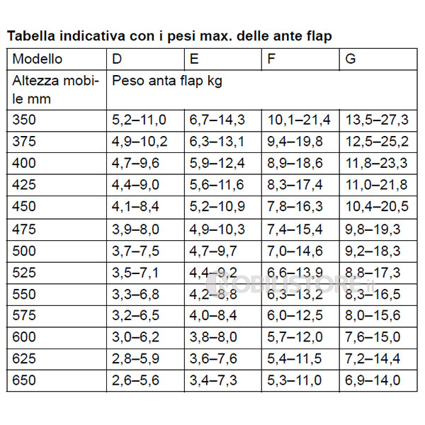 Per ante di altezza 350-650 mm