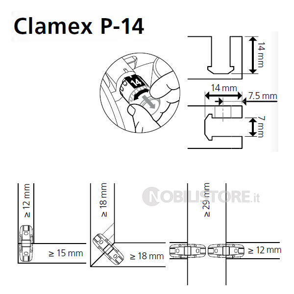 Clamex P-14 viene utilizzata per angolari a partire da 18 mm di spessore del pannello o per giunzioni ad angolo ottuso per spessori a partire da 15 mm