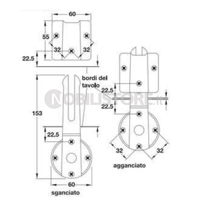 La giunzione permette di collegare in modo stabile prolunghe al piano tavolo. Il montaggio prevede l'avvitamento sotto il piano dell'elemento ad incastro e della relativa contropiastra che si agganciano tramite una leggera pressione. L'elemento ad incastro é rotante a 360° posizione fissa ogni 90°