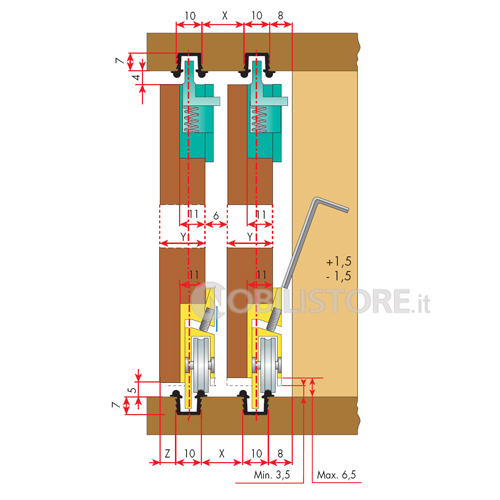 - Binari di scorrimento e guida separati, quindi nessuna limitazione negli spessori anta