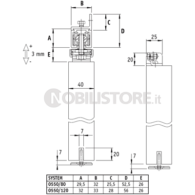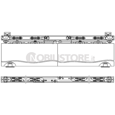 Sistema scorrevole 0550 con carrelli in zama e dispositivo per realizzare ante contrapposte simultanee.