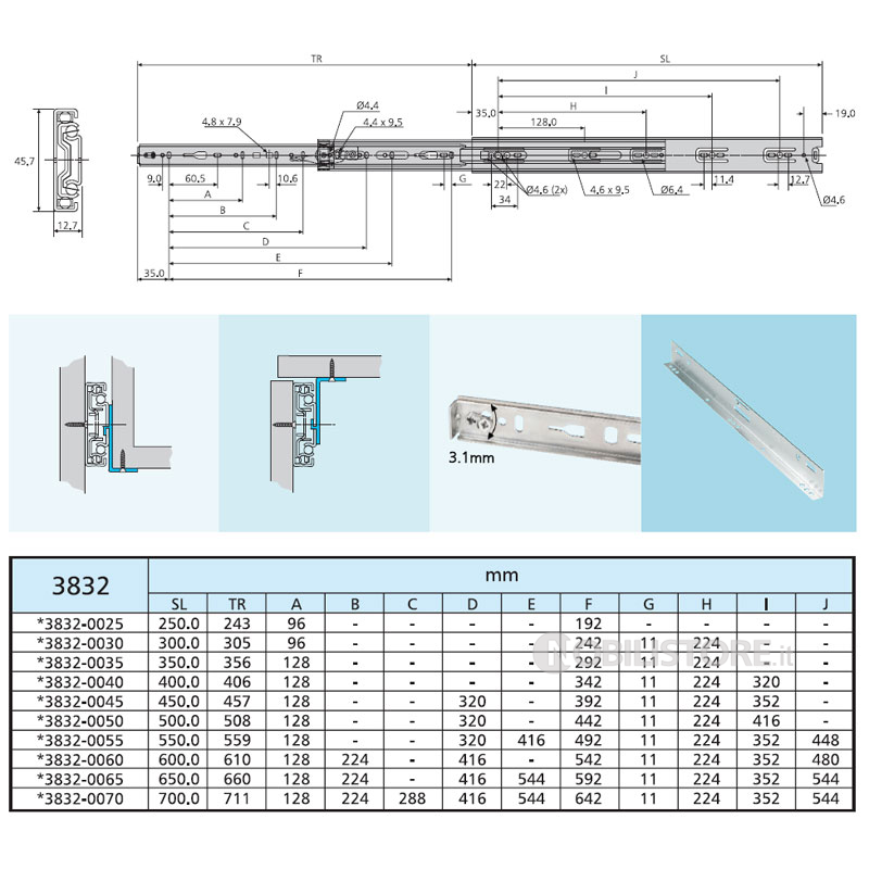 Guide su sfere 3832 a estrazione totale per cassetti in legno