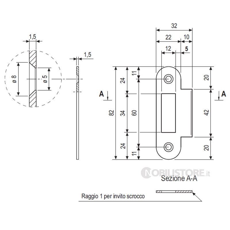 Incontro bordo tondo 22x82 mm, aletta da 10 mm con bordo quadro, a protezione del montante telaio nell'area di contatto con lo scrocco.