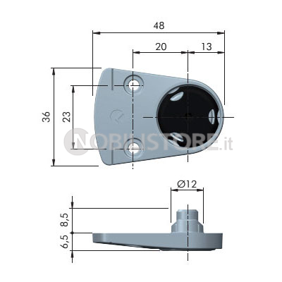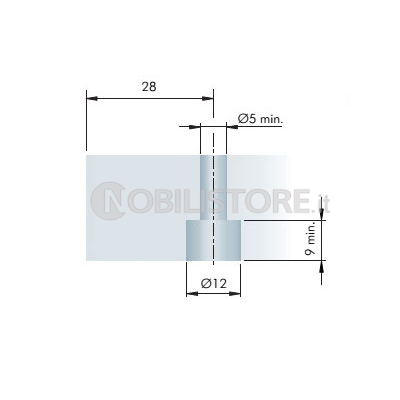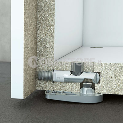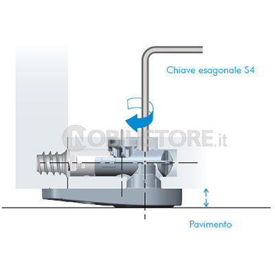 Piedino per mobili con fondo a terra, regolabile con chiave esagonale S4 dall’interno del mobile attraverso il foro dedicato.