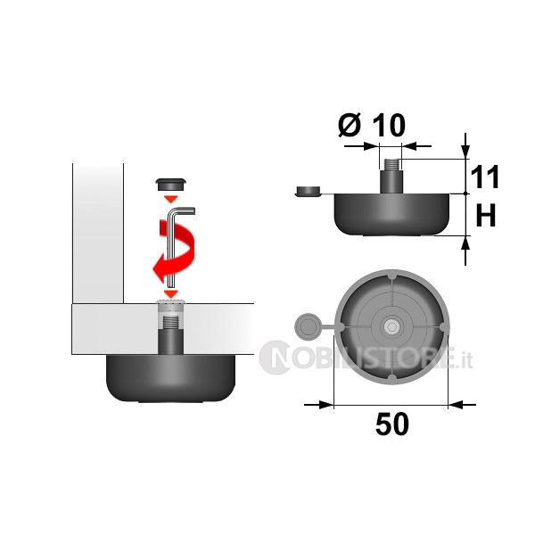 Piedino Ø50 mm, attacco Ø10 mm M8, con tappo