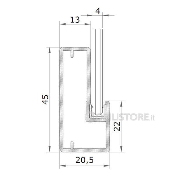 Profilato per ante con telaio in alluminio anodizzato argento.