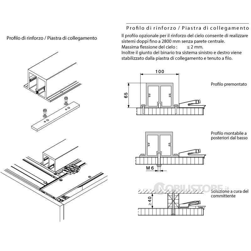 Il profilo opzionale per il rinforzo del cielo consente di realizzare sistemi doppi fino a 2800 mm senza spalla centrale.
