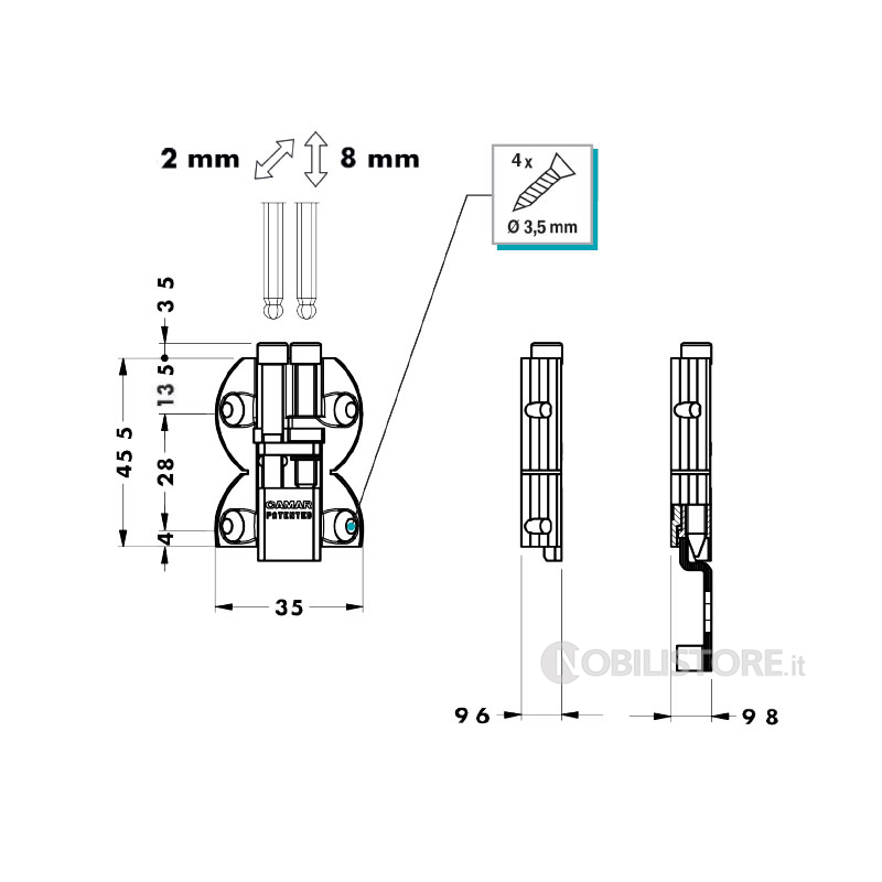 Regolazione: in altezza 8 mm, laterale 2 mm