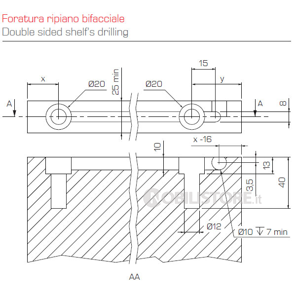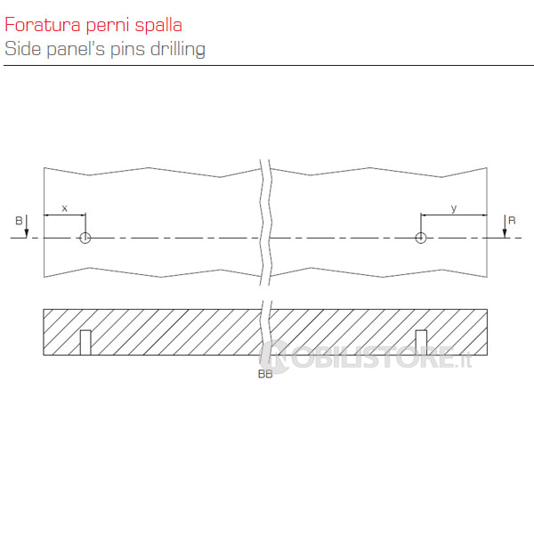 Il giunto reggipiano MonoGhost viene montato all’interno di una scanalatura praticata sul fianco del piano e si ancora alla testa di un perno inserito in un foro praticato sulla spalla.