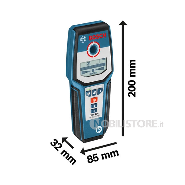 Il rilevatore GMS 120 Professional offre anche la funzione Centre Finder, che indica con assoluta precisione il centro dell’oggetto rilevato e presenta le caratteristiche del materiale. La luminosa ghiera a LED a tre colori indica chiaramente la presenza o l’assenza di oggetti e presenta un foro di marcatura, per annotare direttamente ciascuna scansione. Questo resistente strumento è dotato di protezione in gomma, corpo in materiale antiurto e protezione IP54 contro polvere ed acqua.