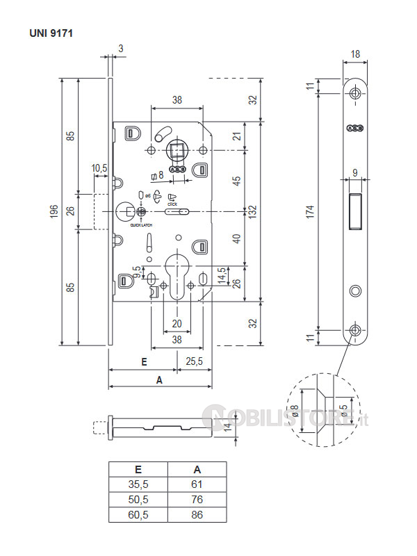 La serratura non presenta sporgenze sul frontale grazie allo scrocco completamente retratto all’interno della cassa.Scrocco retraibile anche mediante cilindro.