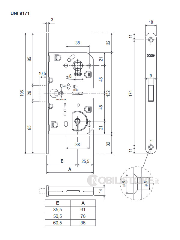 La serratura non presenta sporgenze sul frontale grazie allo scrocco completamente retratto all’interno della cassa.