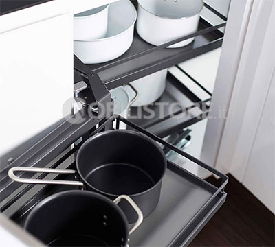 Una vera e propria soluzione “magica” per il vostro angolo: l’elemento si apre con un semplice gesto e mentre due ripiani si portano verso l’esterno del mobile gli altri avanzano all’interno del mobile per consentire un accesso ottimale al contenuto e una perfetta ergonomia.