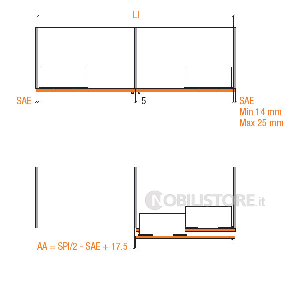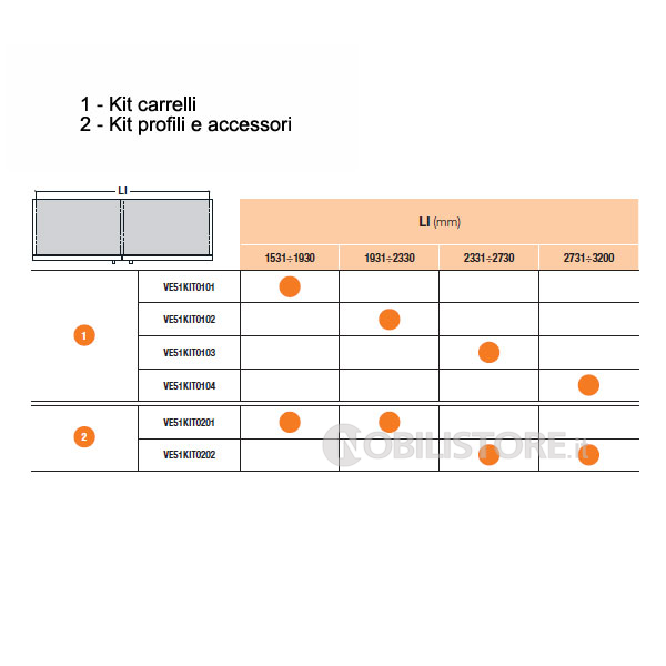 In base alla larghezza interna del mobile (LI) si compone il meccanismo utilizzando un Kit carrelli (1) e un Kit profili e accessori (2)