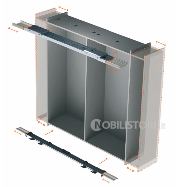 Sistema di scorrimento complanare a due ante ammortizzato con lunghezza personalizzabile per ante con peso fino a 50 kg
