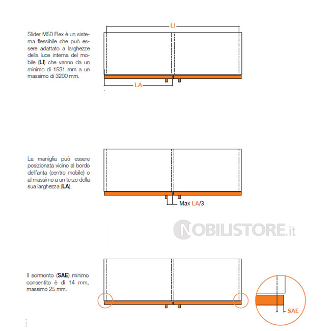 Slider M50 Flex - Sistema complanare a due ante ammortizzato con lunghezza personalizzabile per ante con peso fino a 50 kg.