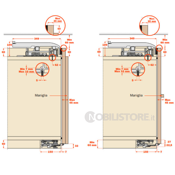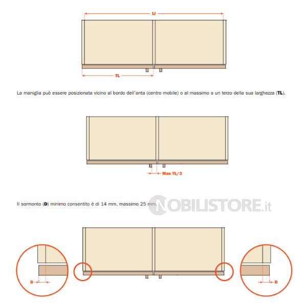 • spessore: minimo 18 mm / massimo 35 mm / massimo con maniglia 45 mm.