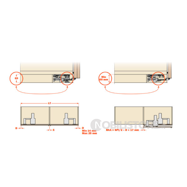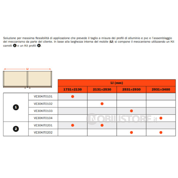 In base alla larghezza interna del mobile (LI) si compone il meccanismo utilizzando un Kit carrelli (1) e un Kit profili e accessori (2)