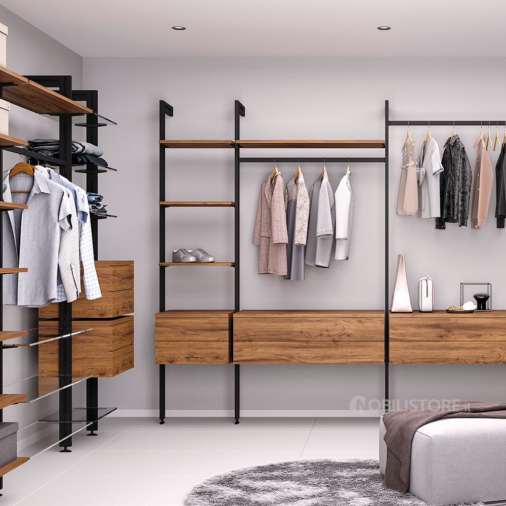 Si possono combinare diversi elementi per creare la tua composizione ideale: mensole in legno o vetro, moduli o piccoli contenitori e barre appendiabiti.